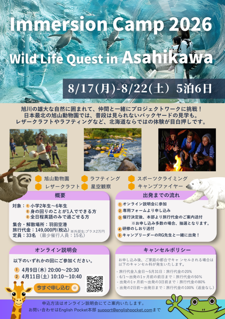 Immersion Canp 2026 in 旭川! 2026年4月13日 最終更新日時 : 2026年4月13日 prime-a 今年のキャンプは旭川! 5泊6日のキャンプです。説明会も開催しておりますのでご検討されている方はぜひご参加ください。 皆様のご参加をお待ちしております! EnglishPocket